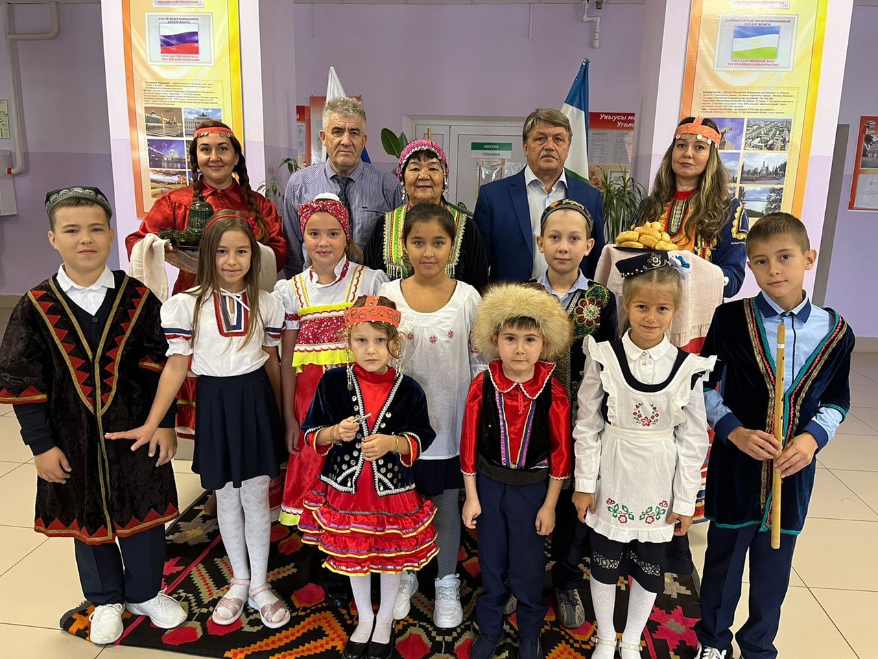 Обучающихся нашей школы в фойе непривычно для всех встречали некоторые ученики и учителя в национальных костюмах нашей страны, что сразу задавало праздничное настроение и ребята с любопытством интересовались поводом такой встречи. Так они узнали, что сегодня День национального костюма. Ученики с удовольствием рассматривали наряды, им рассказывали про орнаменты присущие разным национальностям, ведь, у наших увлеченных своим делом учителей были представлены костюмы и башкирского, и татарского, и украинского, и русского народов. Также, ребята обратили внимание на великолепные паласы, которые, как оказалось, достались нашему лучезарному учителю башкирского языка Шифе Хамитовне, от ее мамы.